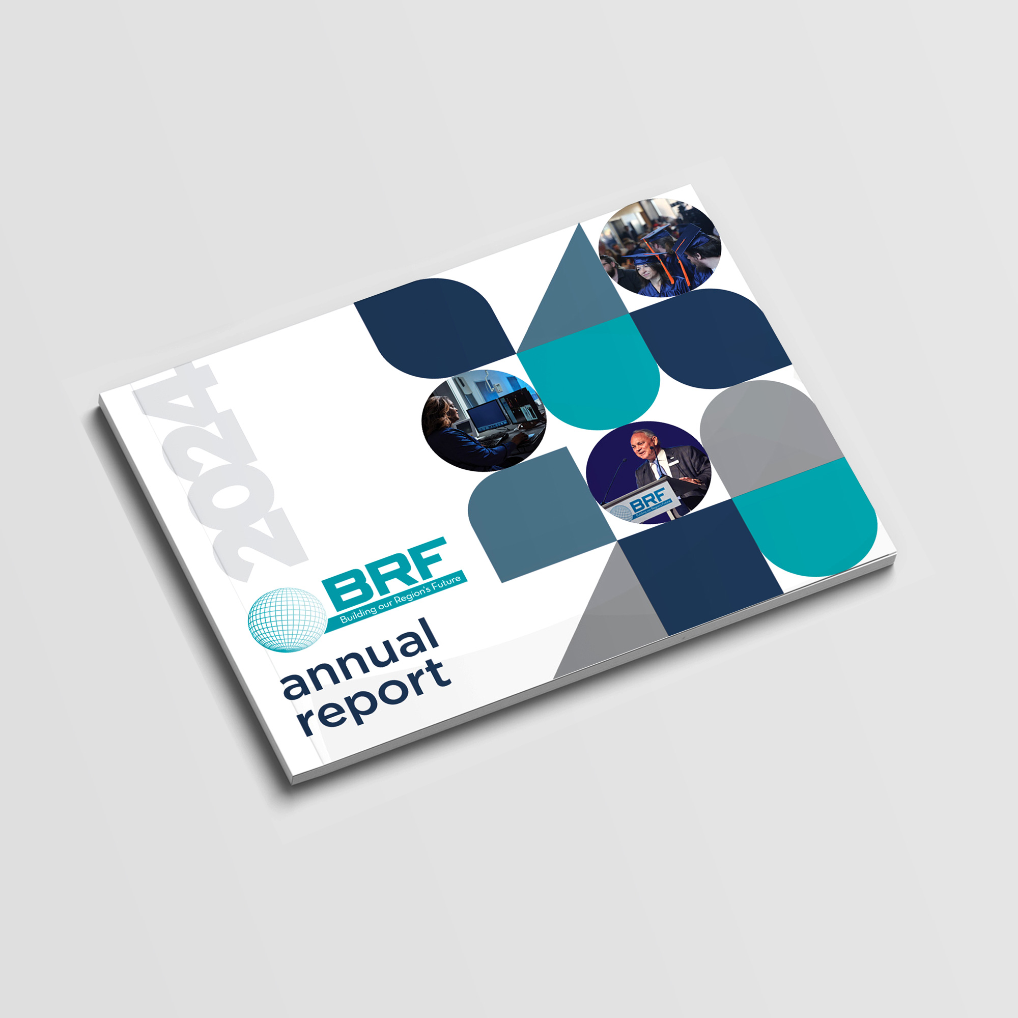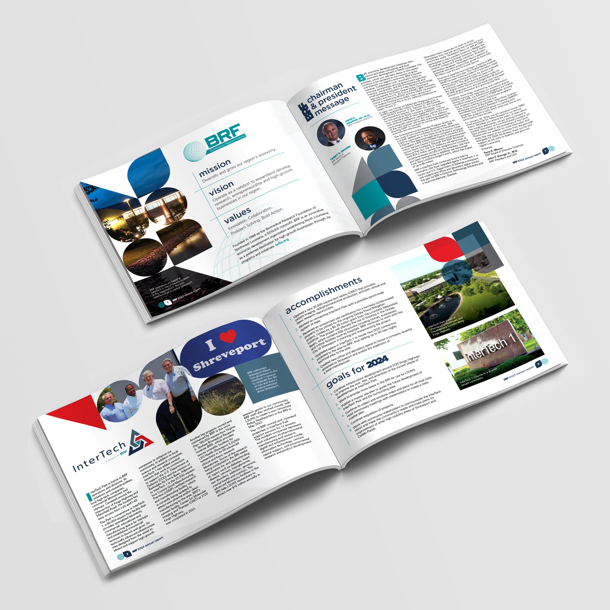 The 2024 annual report for BRF in Shreveport balances professionalism and visual impact while staying true to their brand. Using a modern grid layout, geometric elements, and circular imagery, the design highlights key achievements in an engaging yet sophisticated way. The blue, teal, and gray color palette maintains brand consistency, while bold typography and clean layouts ensure clarity and readability.