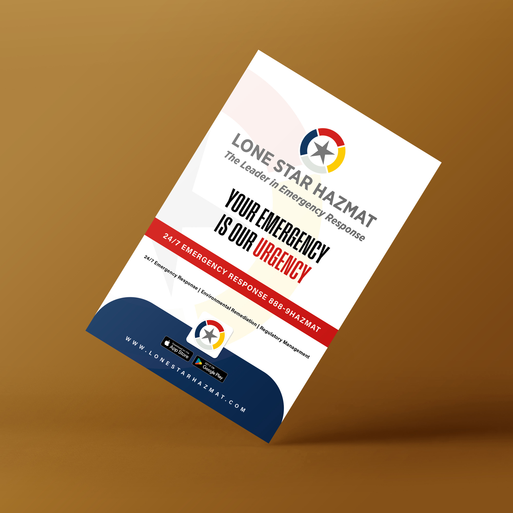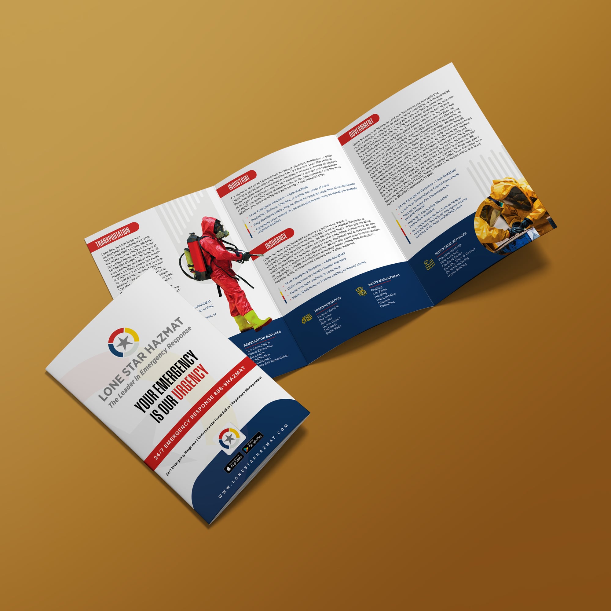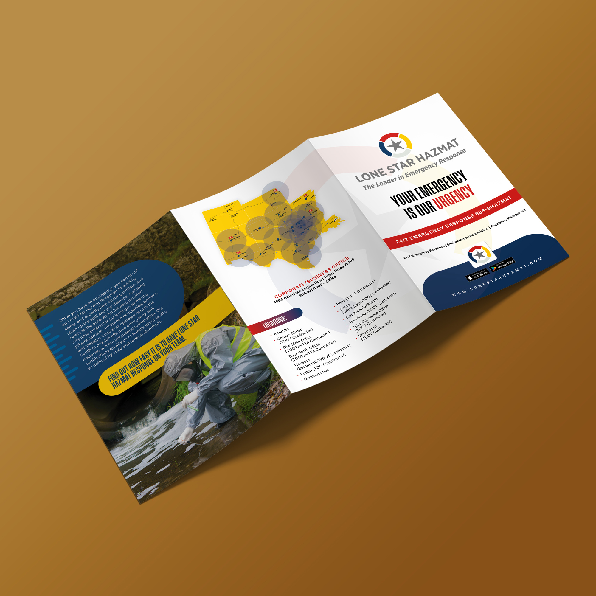 This trifold brochure for Lone Star Hazmat was designed to communicate the company’s emergency response services while maintaining a professional and authoritative brand presence. Using the company’s signature colors and strong visual hierarchy, the design balances engaging imagery with concise, well-organized information to ensure accessibility and readability for their target audience.