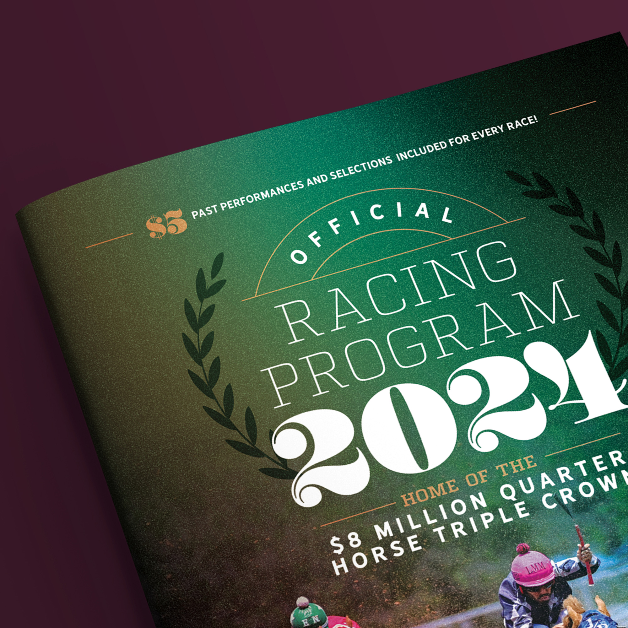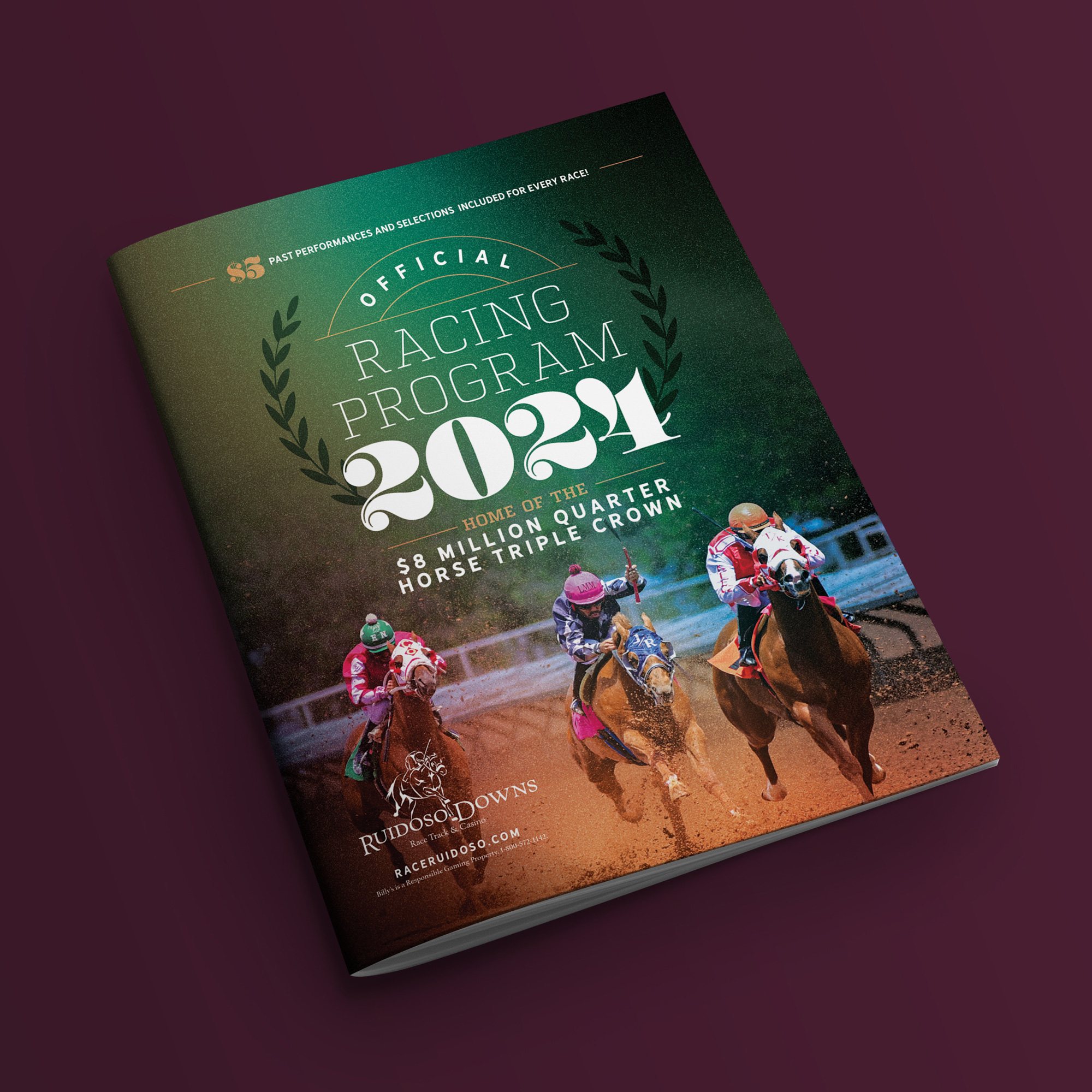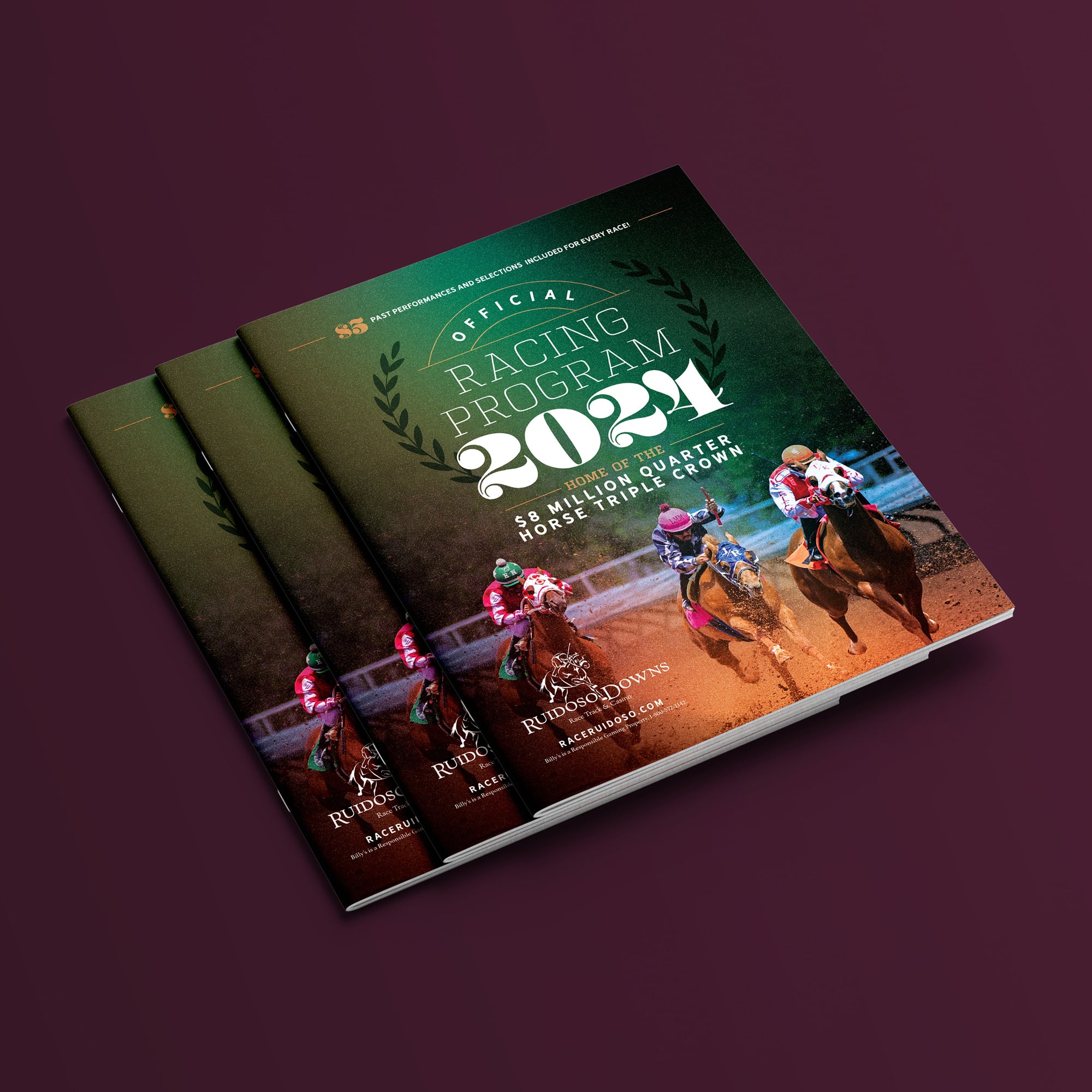 This dynamic Racing Program cover for Ruidoso Downs Racetrack captures the thrill of the sport with bold typography, a rich green backdrop, and an action-packed race scene. Designed to reflect the prestige of the $8 Million Quarter Horse Triple Crown, it blends tradition with excitement, making it an essential keepsake for racing enthusiasts.