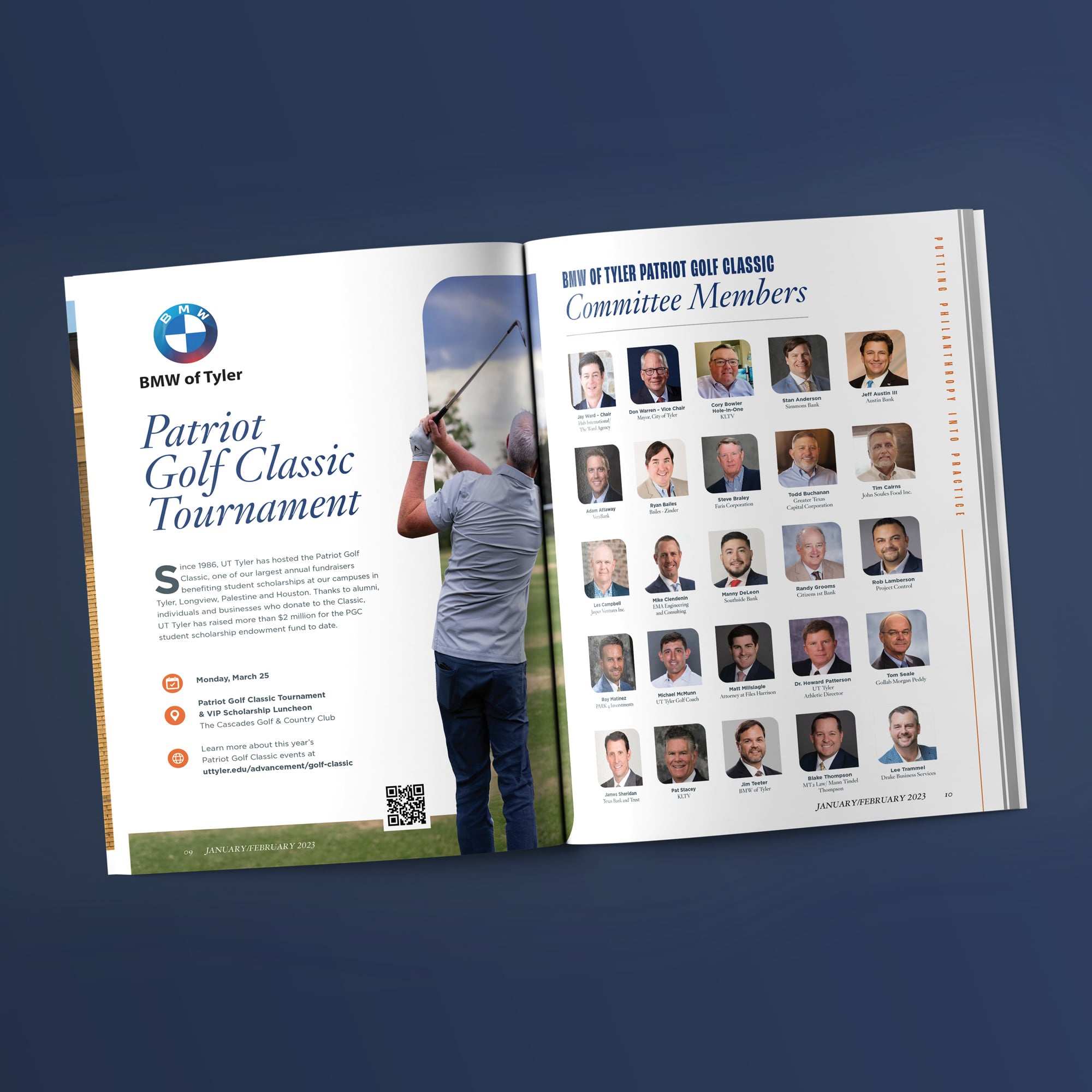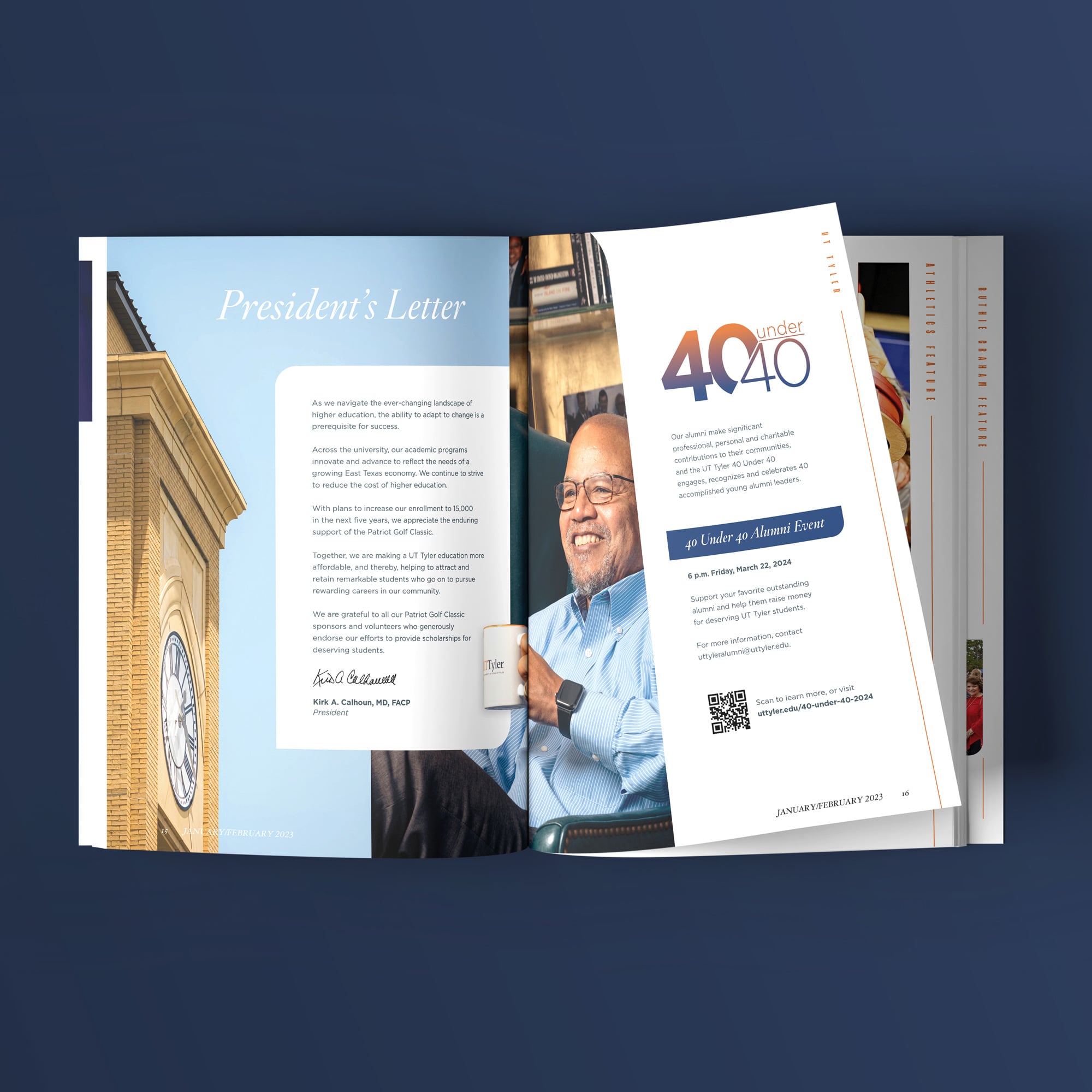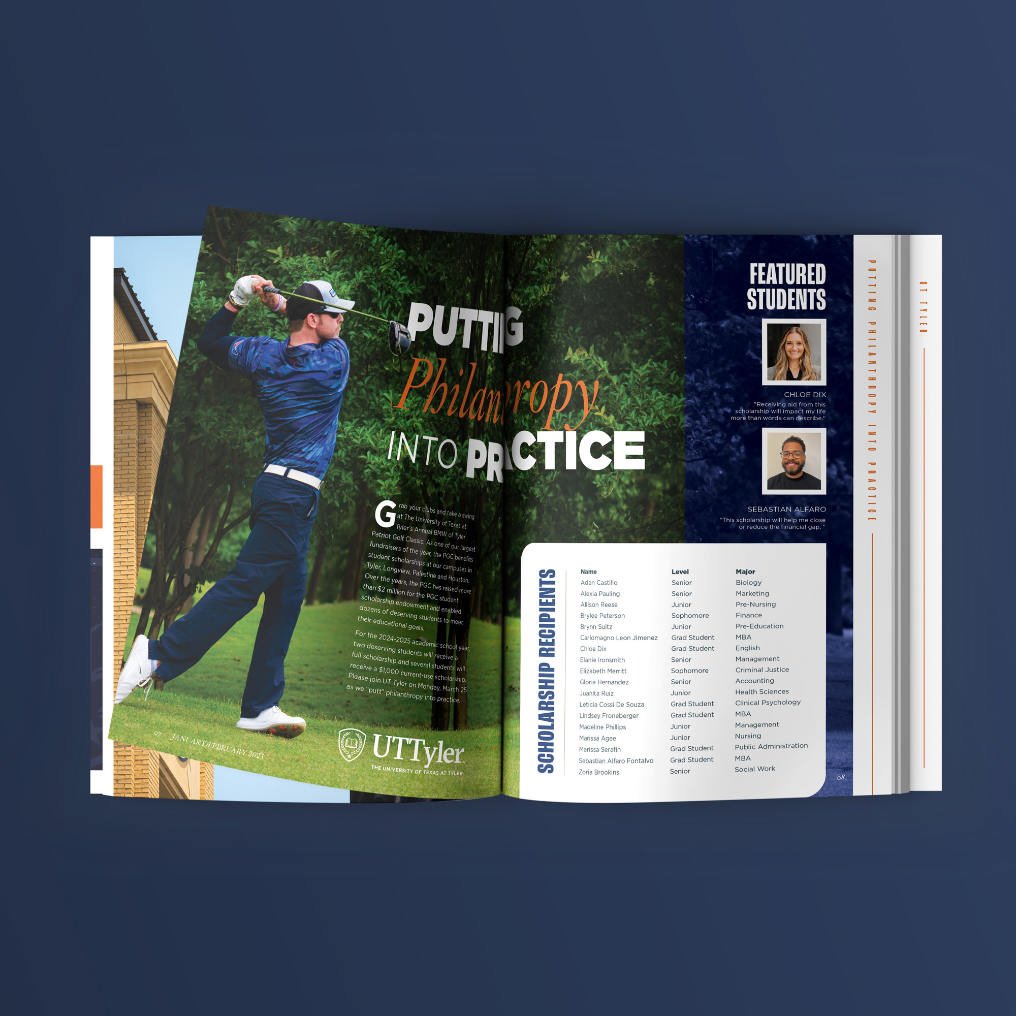 This project involved designing a series of magazine spreads for UT Tyler, adhering to the university's brand identity while creating visually engaging layouts. Each spread highlights key initiatives, including alumni recognition, scholarships, athletics, and major fundraising events. Bold typography, dynamic imagery, and structured compositions were used to balance information with aesthetics. The designs effectively communicate UT Tyler’s mission and community engagement, ensuring clarity while maintaining a polished, professional look.
