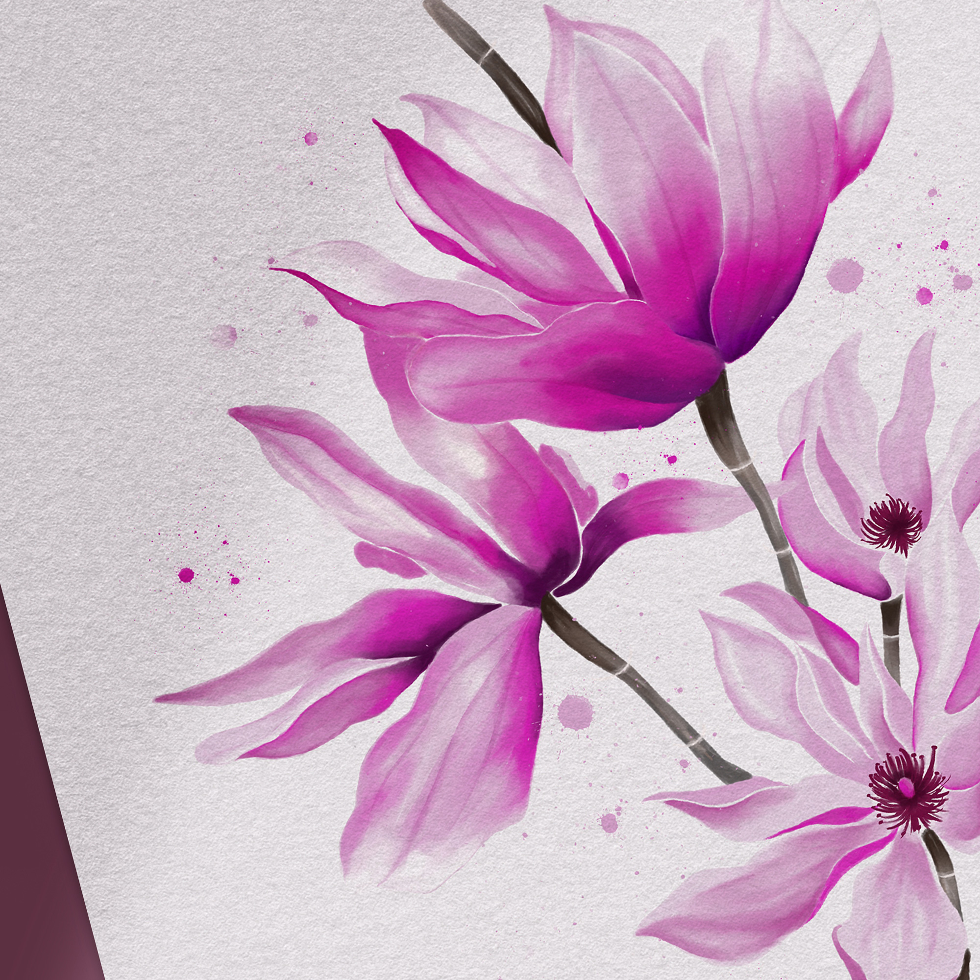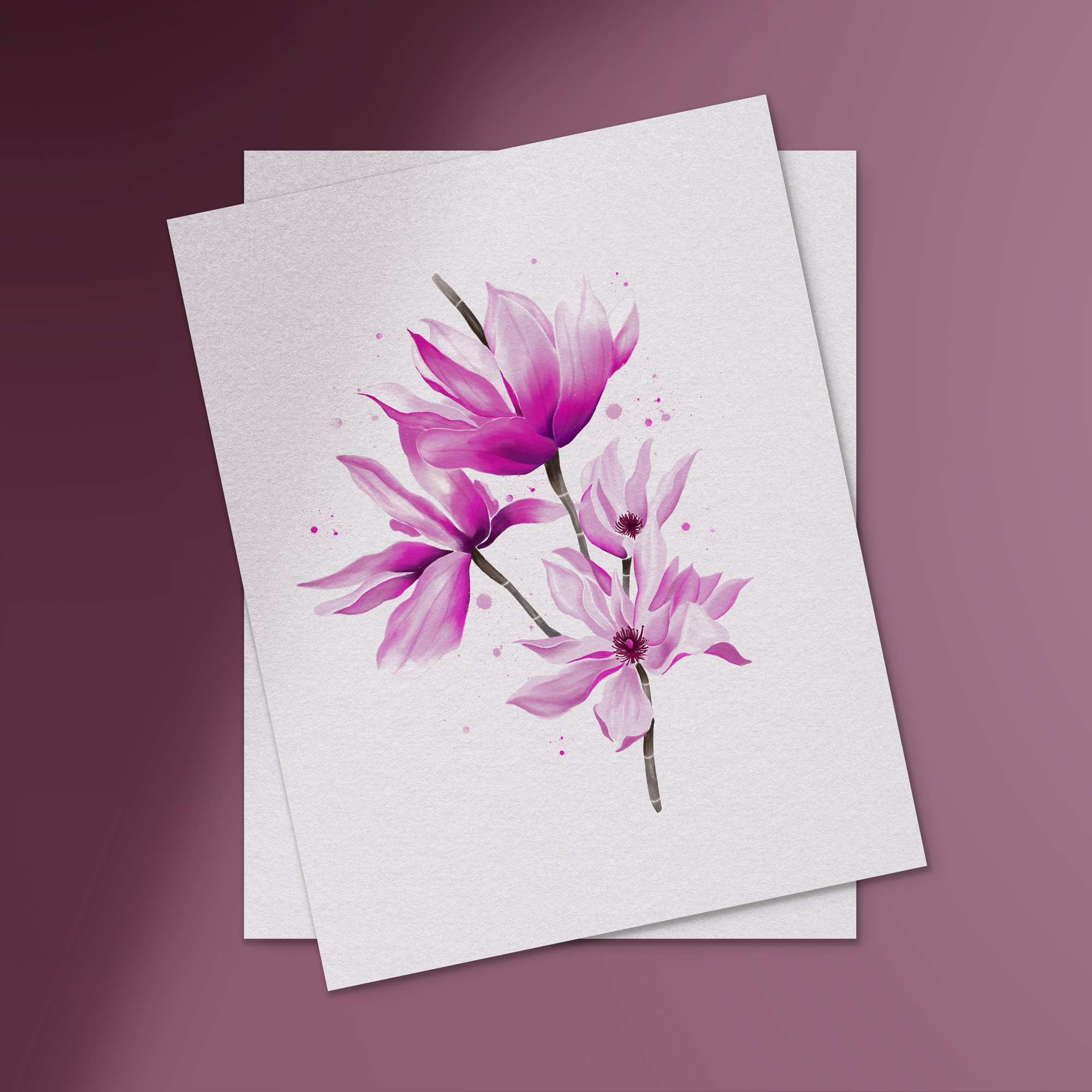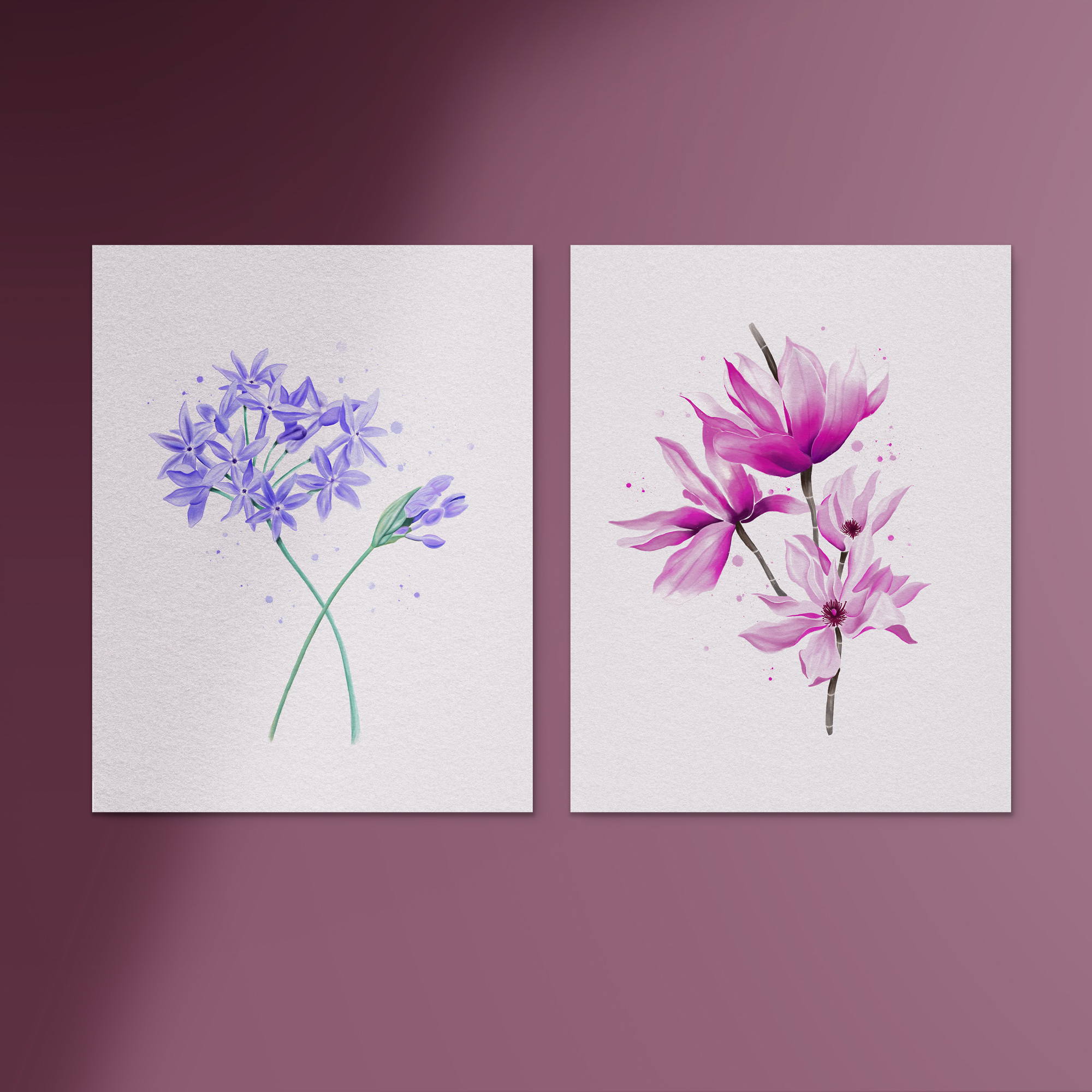Watercolor Flowers Hand-drawn pieces created in Procreate for a friend to hang on her wall. The aim was to capture the delicate, organic feel of real watercolor flowers, blending soft edges and rich hues for a whimsical feel.